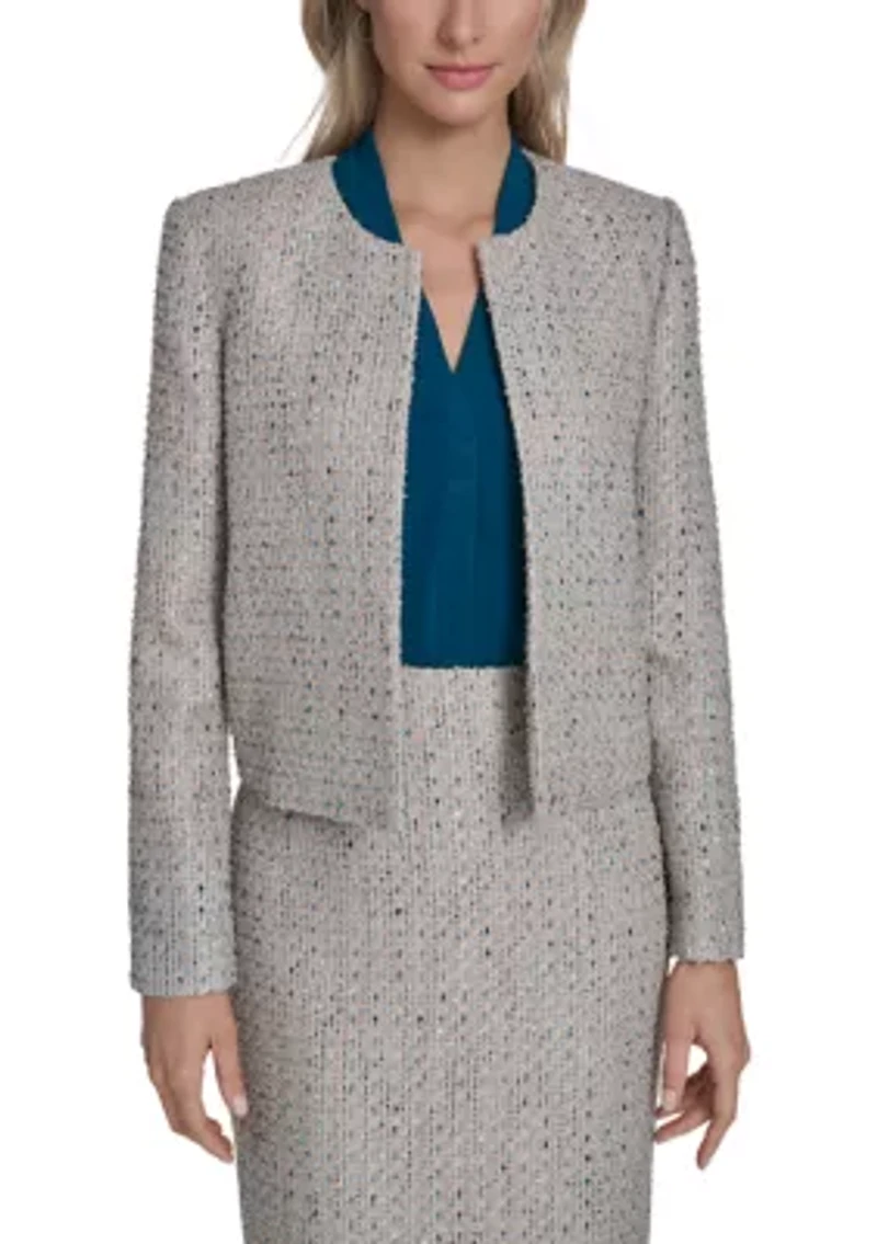 This Calvin Klein jacket is perfect for any occasion, featuring a charming open front design and a stylish tweed construction for a chic look all day long. Open front Crew neck Long sleeves Imported Product Specifications 19.5" L Material & Care 100% polyester Dry clean only