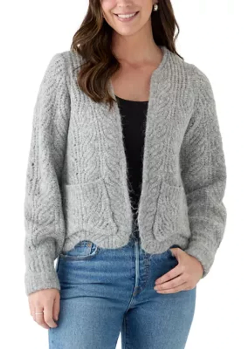 Wrap yourself in cozy comfort with this knit open-front cardigan, perfect for layering. Featuring a scalloped hem, this versatile piece is ideal for everyday wear. Open front Long sleeves 2 patch pockets Unlined Imported Product Specifications 22" L Material & Care Nylon, acrylic Machine washable