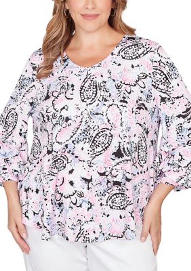 Swirled with pretty paisley and finished with flounced ruffle sleeves, this soft knit top from Ruby Rd brings graceful movement to every outfit. The V-neckline adds a flattering touch, while the puff print detail gives the pattern dimension and texture. Pullover V-neck 3/4 sleeves Unlined Imported Product Specifications 27" L Material & Care Polyester, spandex Hand wash