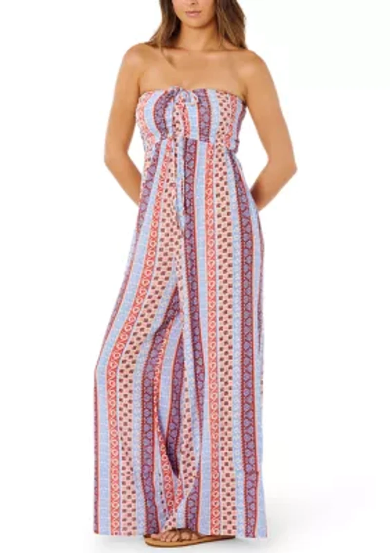 Stay chic and fashionable with this RIP CURL jumpsuit, beautifully accented by a charming strapless neckline and a stylish, playful print offering a comfortable fit for all-day wear. All over yardage print Placement border print detail at hem Adjustable neck tie Smocked bodice Adjustable front detail Internal elastic at bust for support Imported Product Specifications 29" inseam Material & Care Viscose Machine washable