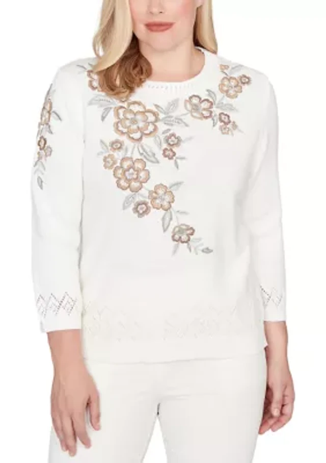 CeCe Women's Floral Embroidery Detail Crewneck Sweater