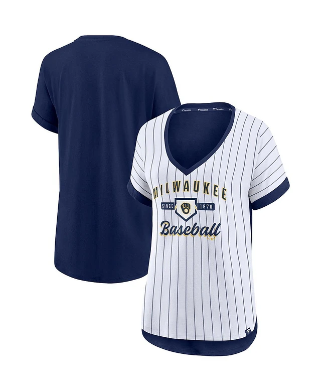 Women's White, Navy Milwaukee Brewers Iconic Noise Factor Pinstripe V-Neck T-shirt