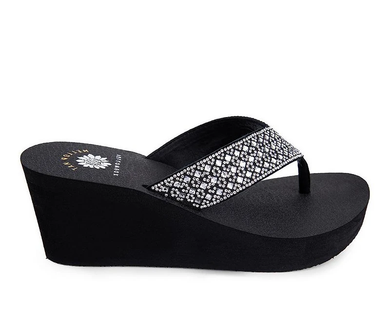 Women's Yellow Box Wyle Flip-Flops The Yellow Box Wyle is a wedge flip-flop sandal designed for casual warm-weather wear. This slip-on style features a raised platform wedge sole and a sparkling embellished strap for a dressed-up look. The open design and toe-post construction give it an easy, everyday feel for outings, weekends, and casual occasions.