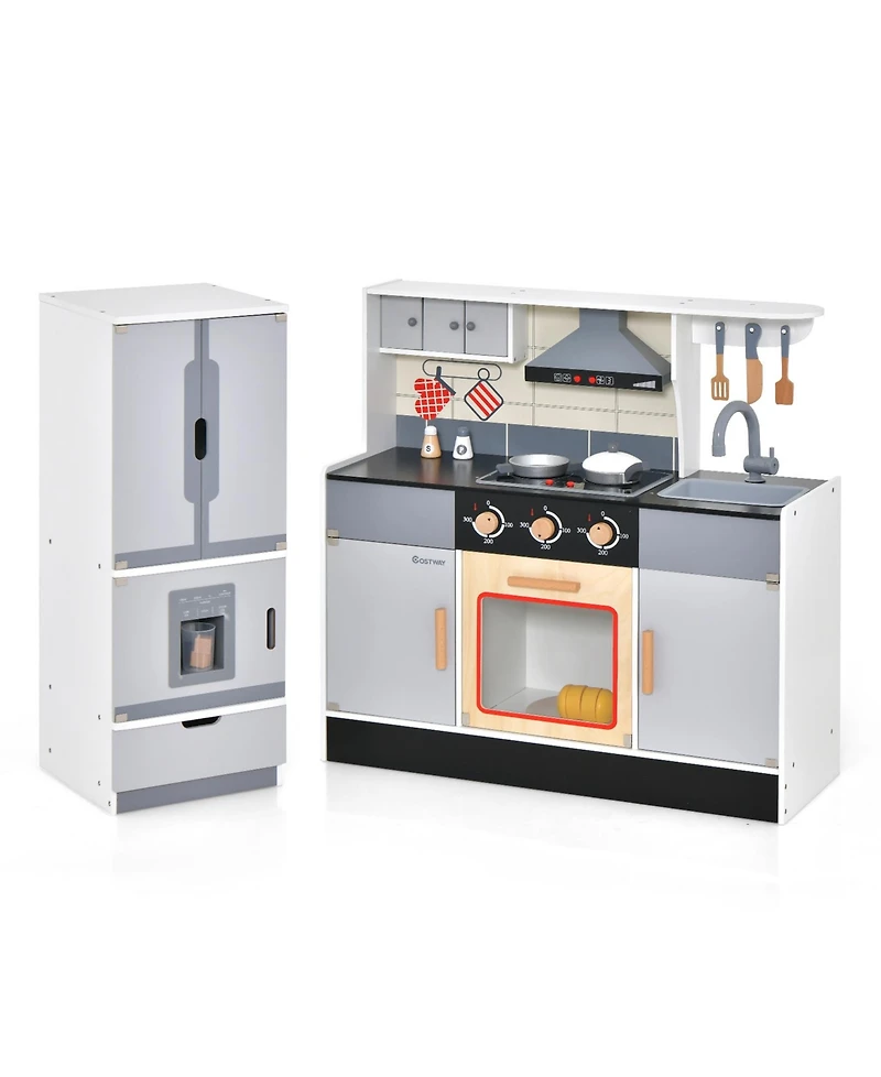 Wooden Chef Play Kitchen and Refrigerator with Realistic Range Hood and Roaster