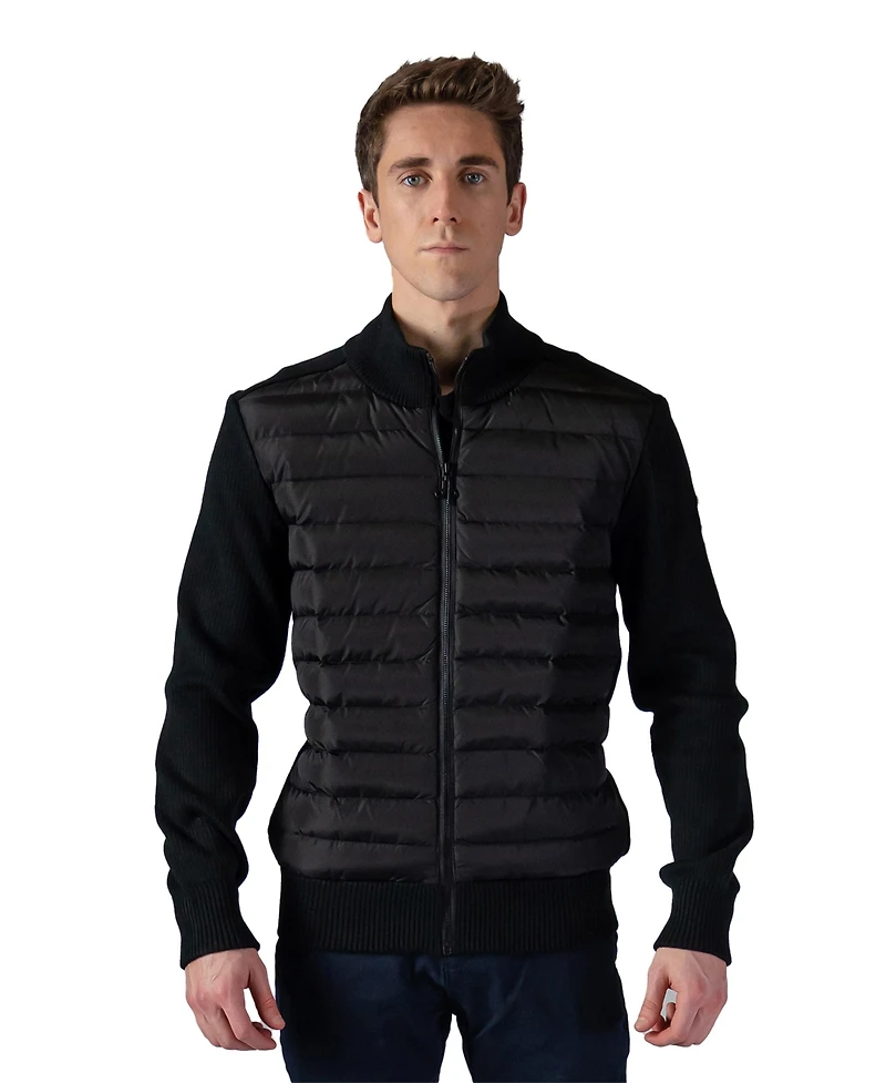 Mens hybrid knit jacket. Canadian-designed premium layering piece. Versatile, lightweight warmth. Cruelty-free.