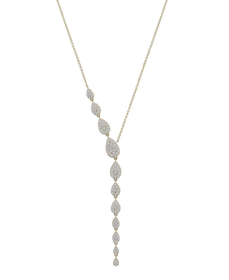 Sparkling clusters of diamonds form an asymmetric design on a glamorous lariat necklace from Wrapped in Love.