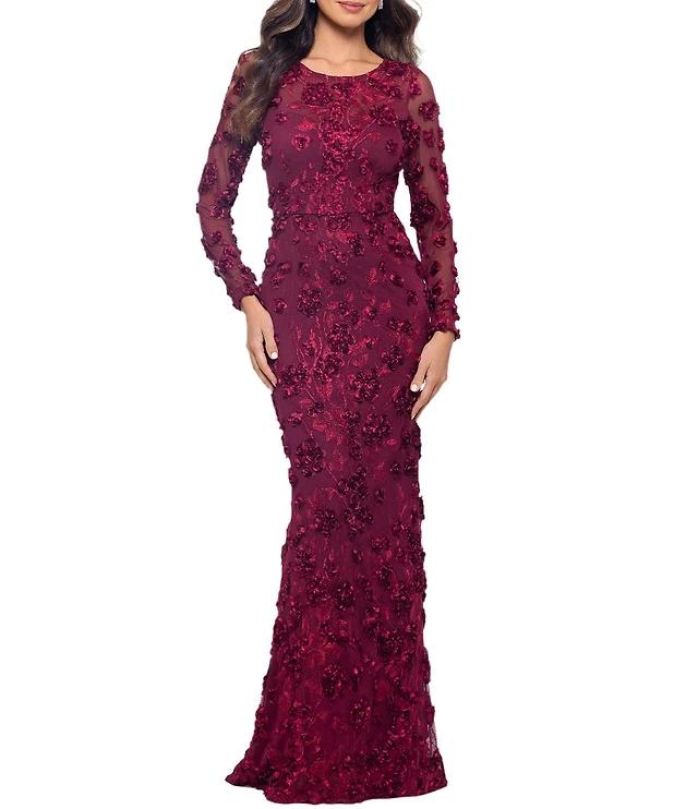 Xscape Illusion 3D Flower Pattern Crew Neck Long Sleeves Sheath Gown