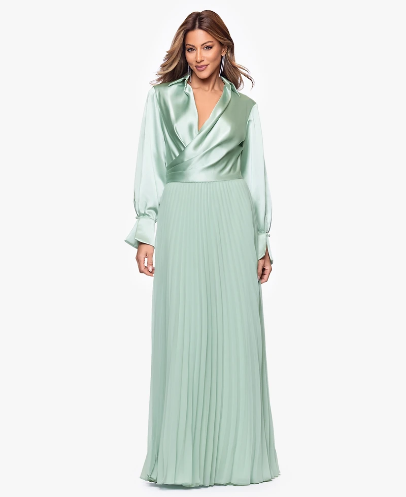 Xscape Women's Long Satin Long-Sleeves Collared Ball Gown