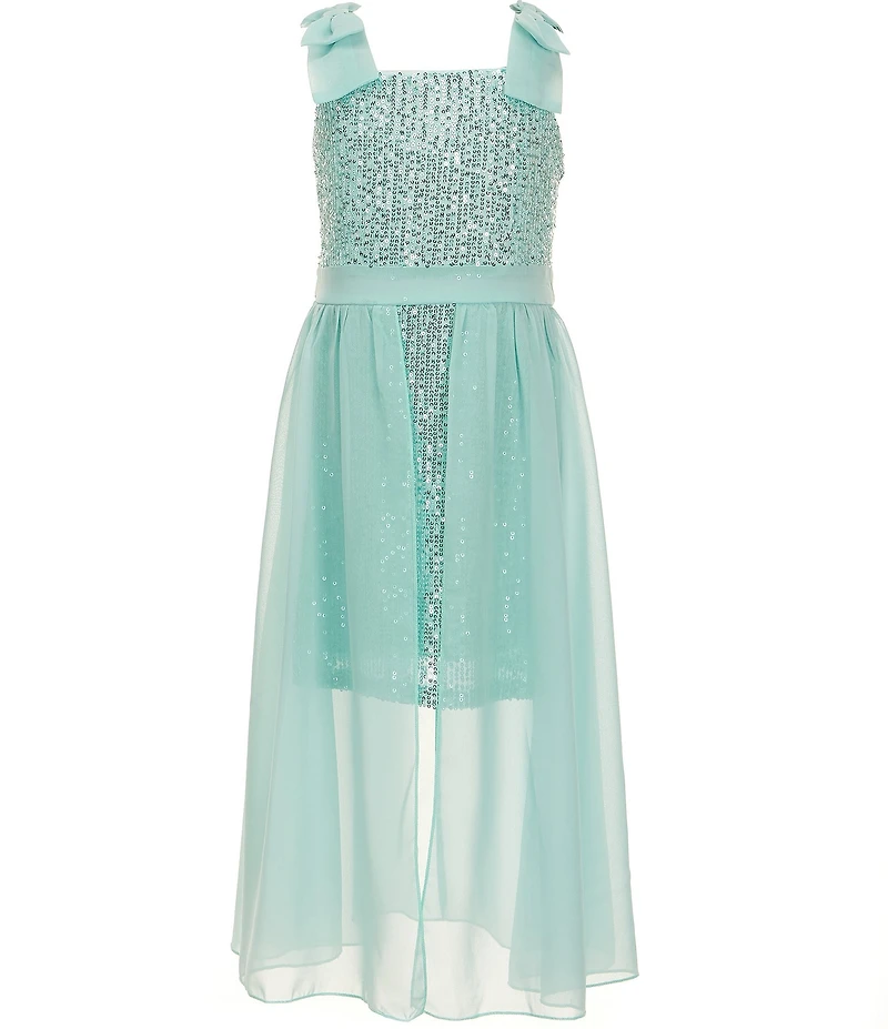 From Xtraordinary, this dress features: Square neckline Sleeveless Bow-accented shoulder straps Sequin-embellished body Chiffon-overlay walk-through long skirt Zippered back Polyester/spandex Hand wash/lay flat to dry Imported.