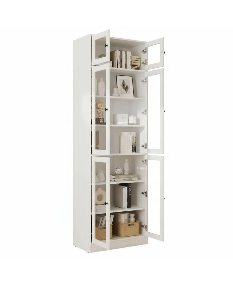 Crafted from high-quality particle board with reinforced metal hardware for lasting durability, this storage unit features a scratch-resistant white finish that maintains a clean look while resisting daily wear. Its space-saving vertical design (23.6"L × 14.9"W × 85.5"H) maximizes storage capacity without occupying excess floor space. With 7 fixed shelves in a 1+3+3 configuration, it offers spacious, practical storage for books, trophies, kitchenware, or tools, with 11.3" shelf heights that accommodate standard items from decor to daily essentials. Clear glass doors elegantly display collectibles while keeping dust out, while sturdy solid doors organize hard-to-categorize items for easy access and neatness. Versatile enough for any room, it works as a living room display cabinet, home office bookcase, kitchen storage unit, or garage organizer, with a neutral white finish that complements contemporary, Scandinavian minimalist, and farmhouse decors.