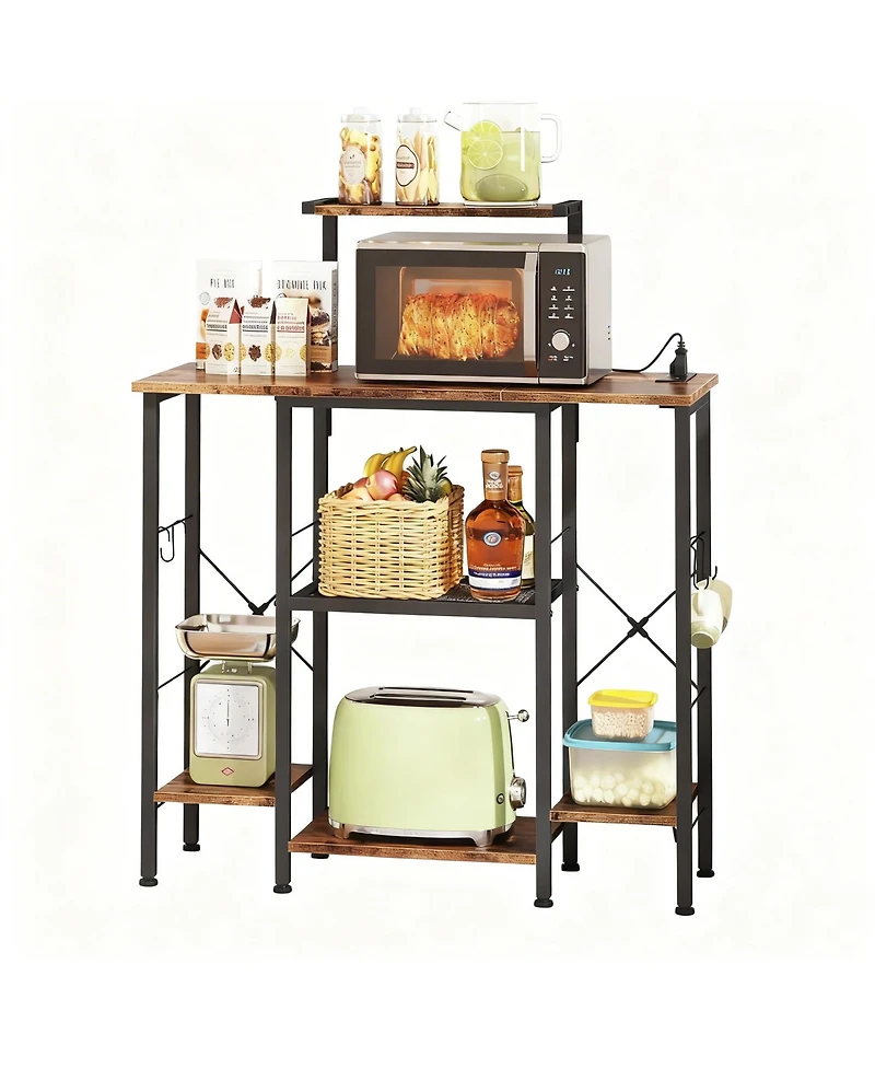 Simplify your kitchen setup with this bakers rack with power outlet, designed to power your coffee maker, toaster, or blender right where you need it.This versatile microwave stand offers 6 spacious shelves, mesh baskets for produce, and 4 hooks for mugs or utensils.Durable and Sturdy Construction: Built from engineered wood and reinforced metal, this bakers rack ensures long-lasting stability. Adjustable feet keep your microwave stand with storage steady even on uneven floors, making it a reliable home for your kitchen appliances and decor.It fits seamlessly into farmhouse, modern, or industrial spaces, creating a warm, inviting coffee bar or utility zone. Quick and Easy Assembly: Forget complicated setups, this microwave stand includes clearly labeled parts and step-by-step instructions for a stress-free installation.Weight: 19.03 pounds. Length: 13.00 inch. Width: 32.00 inch. Height: 39.80 inch.