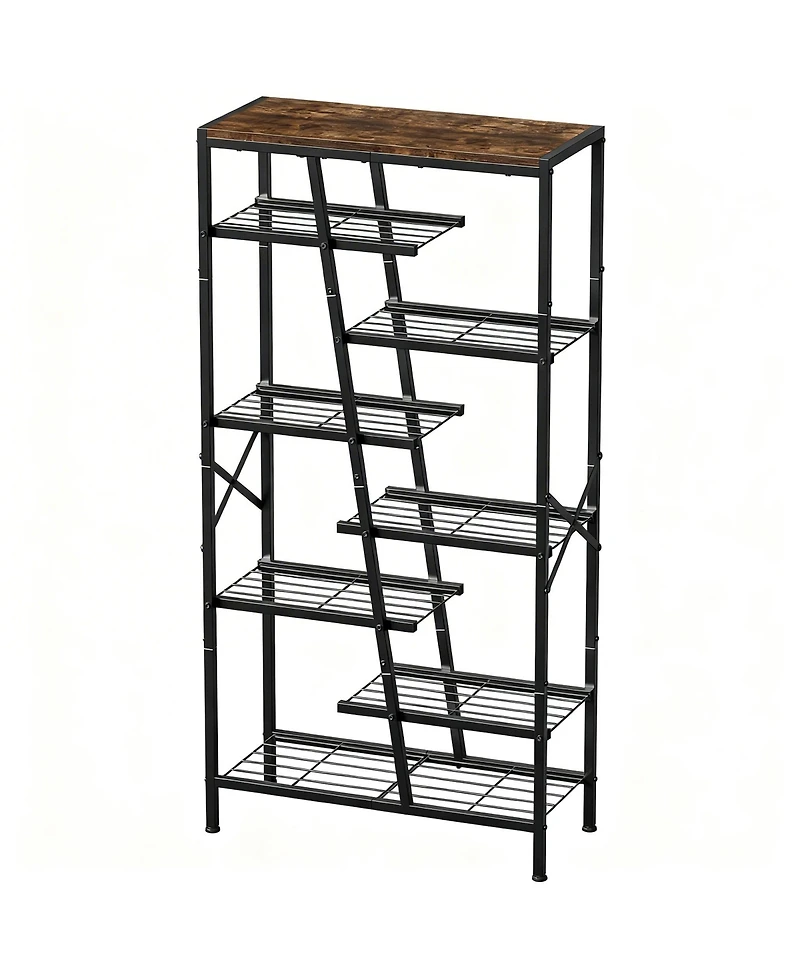 Modern geometric boot rack in black metal and rustic brown wood fits any decor. Eight tiers with six open shelves, 25.6L x 10.8W x 51.8H inches, hold shoes, bags, photos top shelf 50 lb, each mesh shelf 25 lb. Sturdy particleboard and metal frame with X-braces and adjustable feet. Numbered parts and tools make assembly quick. Weight: 0.16 pounds. Length: 25.60 inch. Width: 10.83 inch. Height: 51.00 inch.