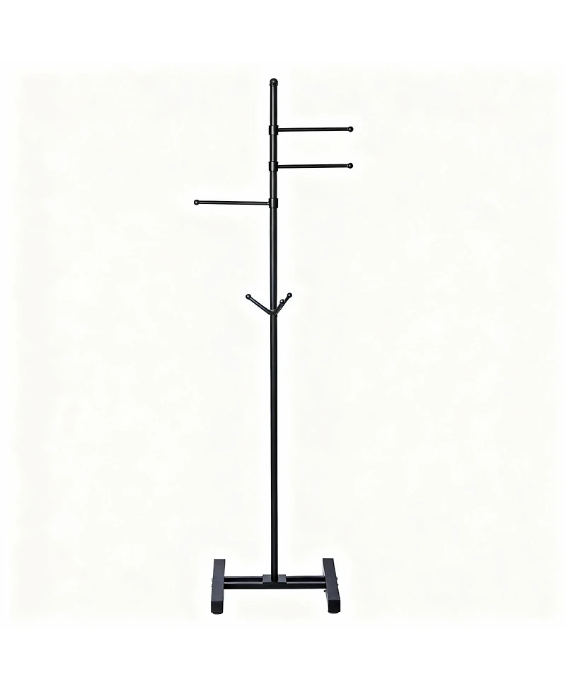 Heavy-duty metal coat rack stands freely on an H-shaped base for wobble-free support. Three swing arms rotate 360° and three fixed hooks hold coats, bags, hats and scarves in entry, bedroom or office. Slim silhouette and matte black finish blend with any decor. Tool-free assembly in ten minutes tighten double-threaded joints for extra durability. weight: 7.34 pounds. Length: 17.30 inch. Width: 16.90 inch. Height: 69.20 inch.
