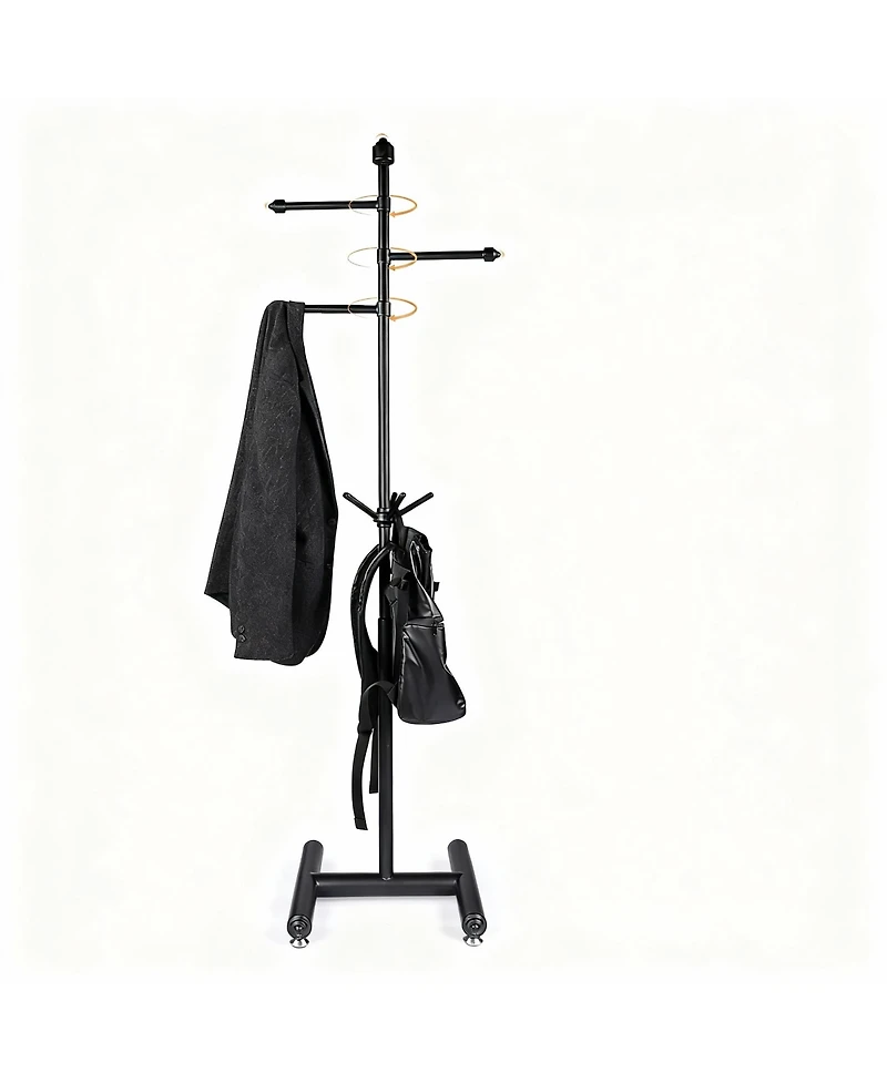 Heavy-duty freestanding coat rack in thickened metal for long life three 360° swing arms and five fixed hooks hold coats, bags and accessories without wobble. H-shaped weighted base plus four smooth wheels let you roll it anywhere—entry, bedroom, office or bath—then lock it in place. Tool-free double-thread assembly takes about ten minutes. Versatile, minimalist look fits any decor. Weight: 9.26 pounds. Length: 16.50 inch. Width: 13.60 inch. Height: 69.20 inch.