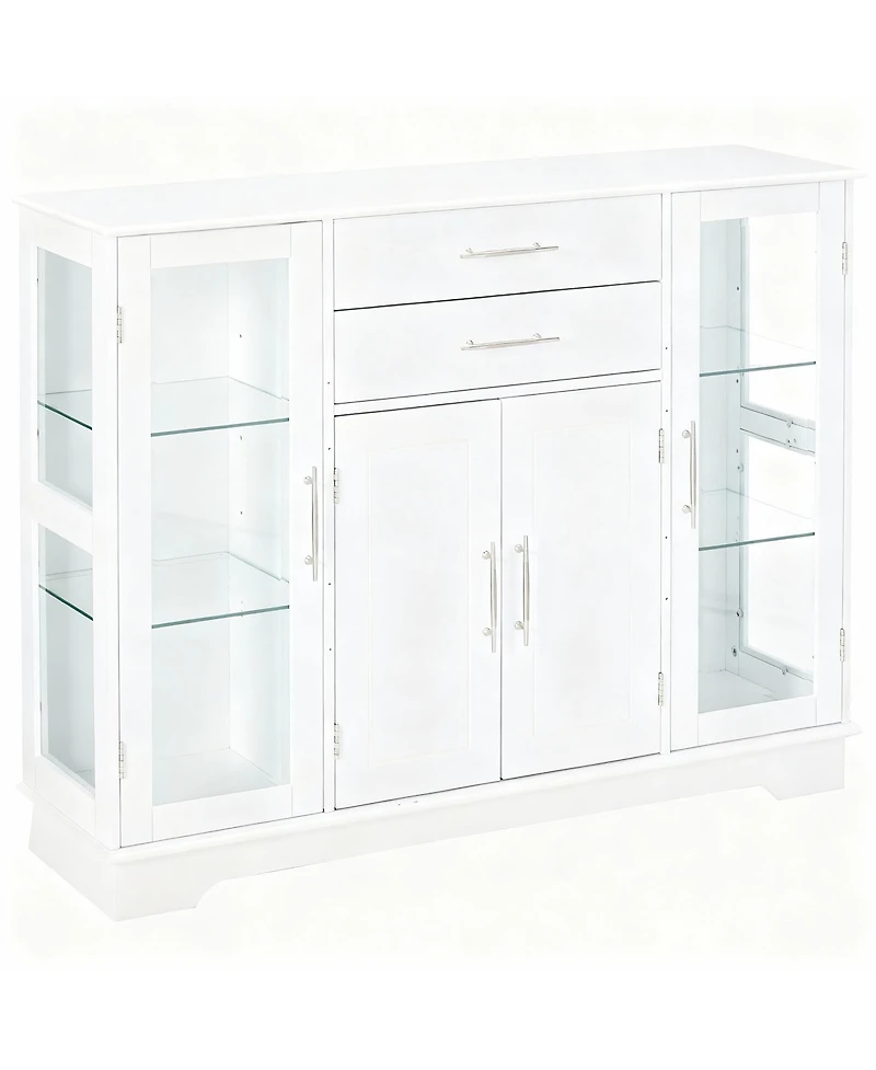 White wood buffet with glass doors, four doors, two drawers, ample shelves, sleek lines, easy assembly. Weight: 0.07 pounds. Length: 12.00 inch. Width: 42.00 inch. Height: 32.00 inch.