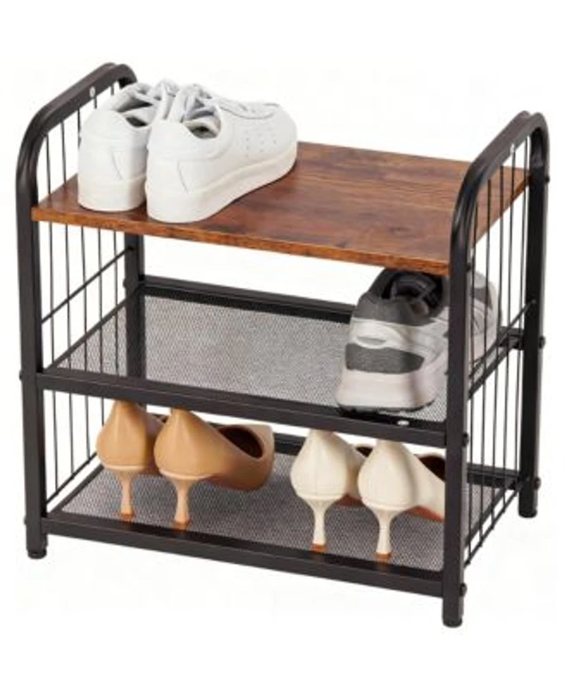 This metal shoe rack is made to be easily assembled. Careful design: Side fences prevent shoes from falling, adjustable foot brackets ensure stability, with the last partition being wooden and the others made of metal mesh, sturdy and durable. Space-Saving: This multi-layer shoe rack maximizes space utilization. It takes up little space and can easily fit into tight corners. Each shelf can hold 1-2 pairs of shoes, from sneakers and high heels to boots and sandals, keeping them organized and easily accessible.Apart from organizing shoes, it can also be used to store your bags, hats, cups, and even kitchen or bathroom supplies, making it suitable for various rooms and storage needs in your home. Lightweight and Portable: Despite its sturdy construction, this shoe rack is lightweight and easy to move around, making it convenient for changing its location within your living space. Weight: 8.82 pounds. Length: 10.24 inch. Width: 17.32 inch. Height: 29.33 inch.