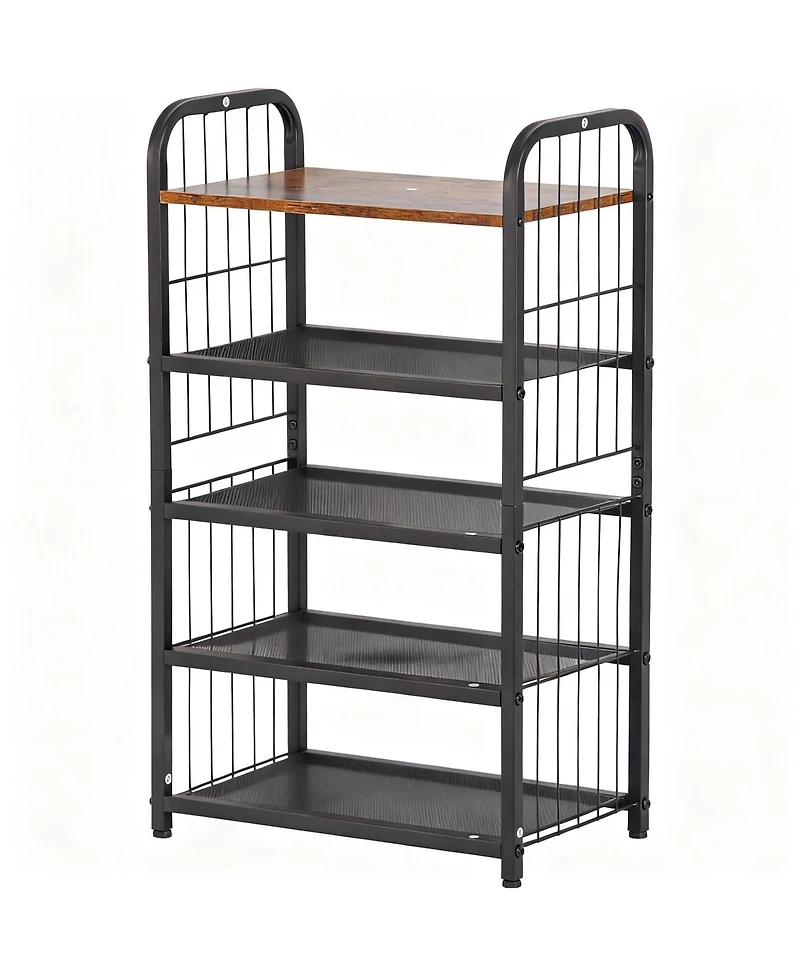 This metal shoe rack is made to be easily assembled. Careful design: Side fences prevent shoes from falling, adjustable foot brackets ensure stability, with the last partition being wooden and the others made of metal mesh, sturdy and durable. Space-Saving: This multi-layer shoe rack maximizes space utilization. It takes up little space and can easily fit into tight corners. Each shelf can hold 1-2 pairs of shoes, from sneakers and high heels to boots and sandals, keeping them organized and easily accessible.Apart from organizing shoes, it can also be used to store your bags, hats, cups, and even kitchen or bathroom supplies, making it suitable for various rooms and storage needs in your home. Lightweight and Portable: Despite its sturdy construction, this shoe rack is lightweight and easy to move around, making it convenient for changing its location within your living space. Weight: 8.82 pounds. Length: 10.24 inch. Width: 17.32 inch. Height: 29.33 inch.
