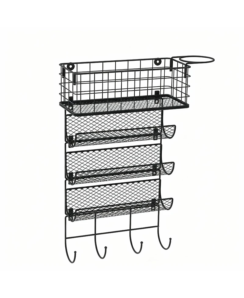 5-in-1 wall organizer. The iron ring holds a hot dryer safely hot tools can also rest on the heat-safe mesh. Mount with screws on wood or plaster, or with included adhesive on smooth tile or glass wait 48 h before loading. Use in bathroom, kitchen or on cabinet doors for appliances, bottles or towels. Set includes 3 mesh, 1 ring, 1 basket, 4 hooks overall 20 in high, 15.6 in wide ring 3.8 in dia basket 11.8×5.1×4 in. Weight: 0.99 pounds. Length: 5.10 inch. Width: 15.60 inch. Height: 20.00 inch.