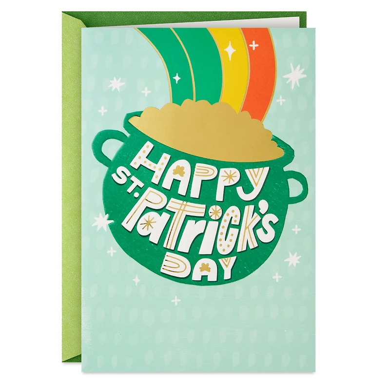 St. Patrick's Day musical greeting card features an iconic image of a pot of gold at the end of a rainbow with foil and embossed accents paired with a sweet St. Paddy's compliment and an Irish song.