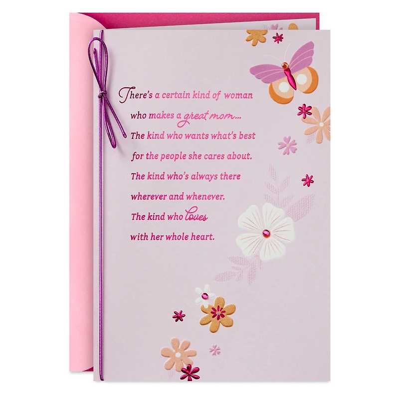 Mother's Day greeting card features an illustration of a purple and orange butterfly and pretty flowers scattered across a bright pink background with a purple elastic cord bow. A message in bright pink celebrates the kind of mom she is.
