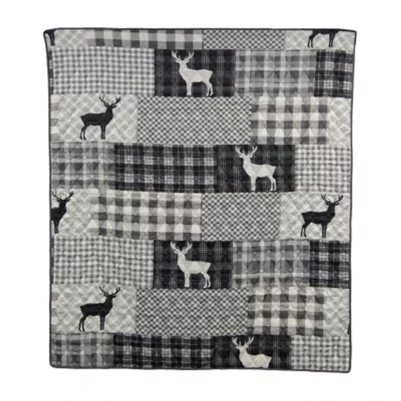 Introducing the Ridge Point Quilted Throw from Your Lifestyle by Donna Sharp, a must-have for anyone with a passion for the outdoor lifestyle. This exceptional lounging ensemble combines functionality, style, and comfort, making it the perfect addition to your bedroom, cabin, lodge, or lake house. Crafted with meticulous attention to detail, this handsome quilted throw boasts a reversible design, allowing you to switch up your bedroom's look with ease. The quilt features a delightful hopscotch patchwork pattern, showcasing a charming combination of plaid and deer motifs. The color palette includes shades of warm grey, charcoal, and ivory, evoking a sense of rustic elegance and timeless appeal. Made with your convenience in mind, this quilted throw is crafted from easy-care, machine washable fabric. Simply toss it in the washing machine for a quick and effortless refresh, ensuring that your bedroom always looks and feels its best.