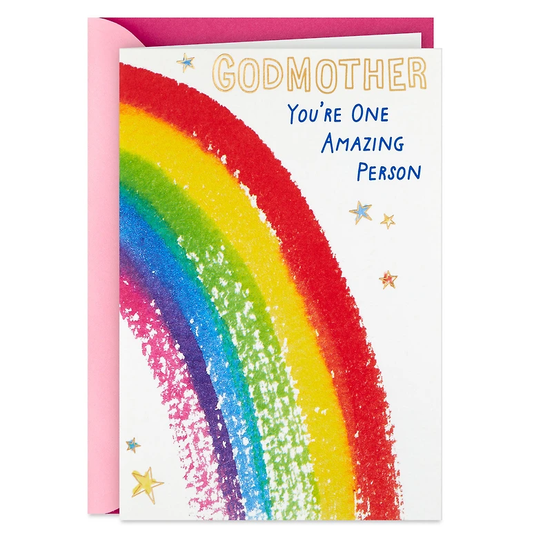 Mother's Day greeting card for your godmother features an illustration of a bright rainbow and stars paired with a sweet message of appreciation for your blessed godmother.
