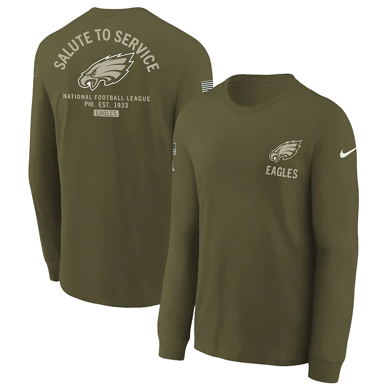 Join the Philadelphia Eagles in supporting those who bravely serve our country with this 2025 Salute to Service Sideline Long Sleeve T-Shirt by Nike. It replicates the military-inspired design and American flag patch the team wears. Lightweight jersey fabric keeps young fans cool and comfortable as they honor our nation's heroes in this Philadelphia Eagles tee. The NFL does not profit from the sale of Salute to Service products. Charitable contributions are awarded by the NFL Foundation to the NFL's Salute to Service nonprofit military partners.