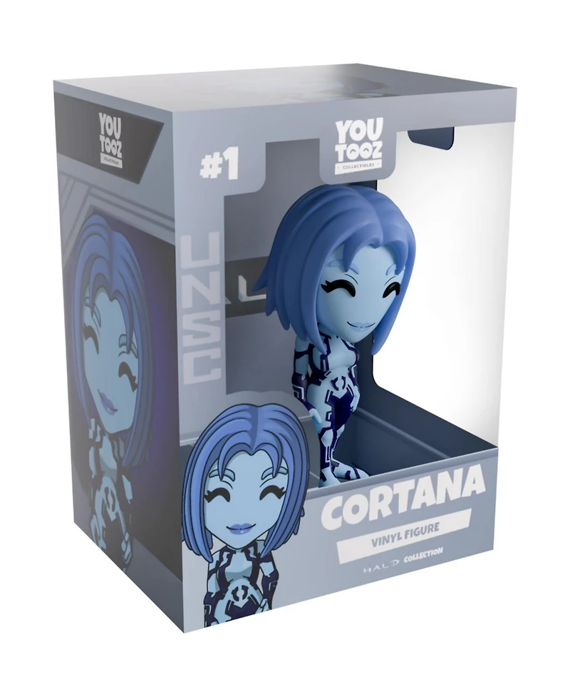 Cortana enters the battlefield with a brilliant glow and sharp wit, perfectly rendered in this stunning Youtooz debut from the Halo universe.Standing at 4.5 inches tall, Cortana brings her digital brilliance to life with a sleek and confident pose. Her glowing blue figure features intricate dark circuit-like markings that trace down her arms, torso, and legs, while her head tilts slightly with a knowing smile. Deep blue hair is styled in a side-parted undercut, falling gracefully to her shoulder. With one hand resting on her hip, she radiates both charm and intelligence. The exterior of her packaging shows her looking up at Master Chief in a moment of connection, while the light grey interior features sharp angular patterning inspired by Halo s design language. The protective sleeve carries the Unsc logo and reveals the figure through a large front window, all secured in a matte, embossed sleeve and custom-fitted plastic protector.Whether she s guiding a Spartan or stealing the s…