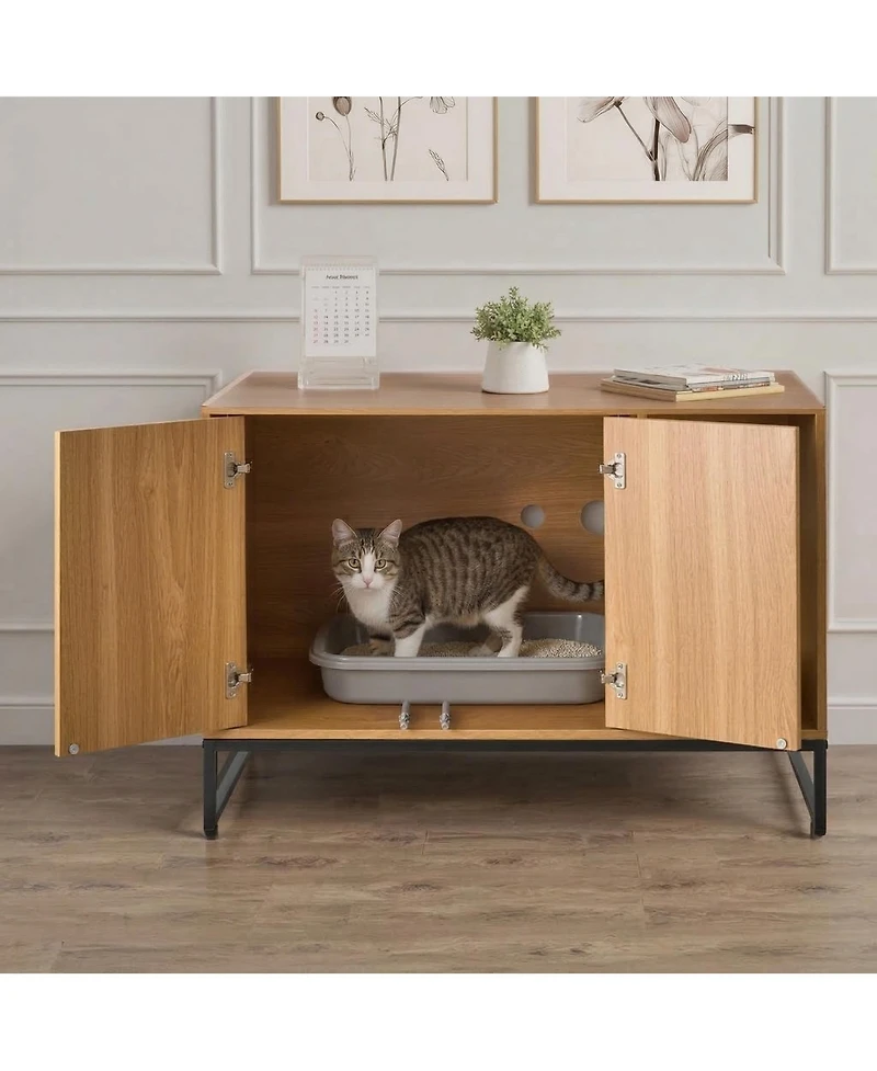 Maintain a fresh and stylish living space with this enclosed cat litter box cabinet, designed to conceal odors while complementing your home decor. The clever ventilation system actively minimizes unwanted smells, while the spacious interior accommodates most standard litter boxes with room to spare. Built with a sturdy metal leg frame and durable construction, this piece supports decorative items on top and supplies inside without sagging over time. Thoughtful details—from press-to-open doors to integrated scratching surfaces—make daily maintenance effortless, giving you a practical solution that looks nothing like pet furniture.