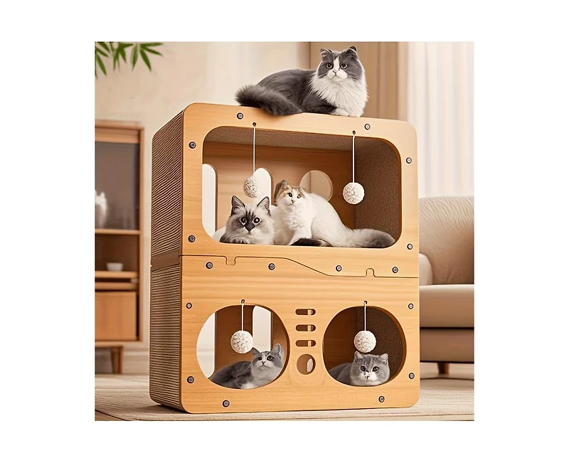 This two-storey cat villa features a space-saving vertical design, crafted from solid wood in warm yellow-brown tones to blend seamlessly with minimalist home decor. Double-sided hemp rope wrapping satisfies cats scratching instincts while protecting furniture. Sturdy wooden structure ensures durability and safety, ideal for multi-cat households and small cats weighing 11-25 lbs. With 20.5" height, it offers integrated space for cats to rest, play and exercise, combining cute style with practicality for indoor use. Easy to assemble, it s a functional and stylish addition to any cat home.