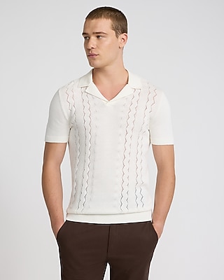 This short sleeve sweater polo is crafted from breathable cotton and features an open knit zig zag pattern and a camp collar.