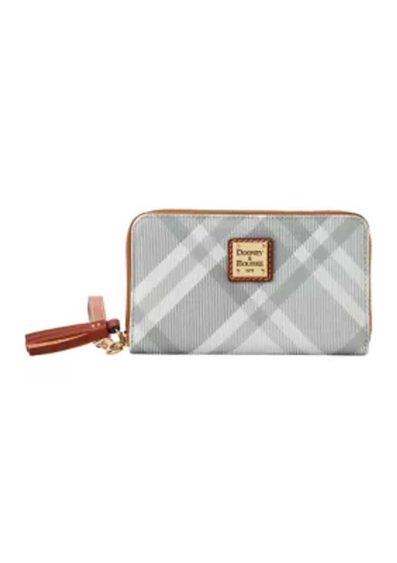 A functional-chic Dooney & Bourke wristlet, perfect for travel with its lightweight Italian coated cotton material. 6.5" strap drop Interior: one inside zip pocket, one inside slip pocket, four credit card slots Imported Product Specifications 6" H x 0.5" W x 9.5" L Material & Care Plastic Clean with a soft cloth