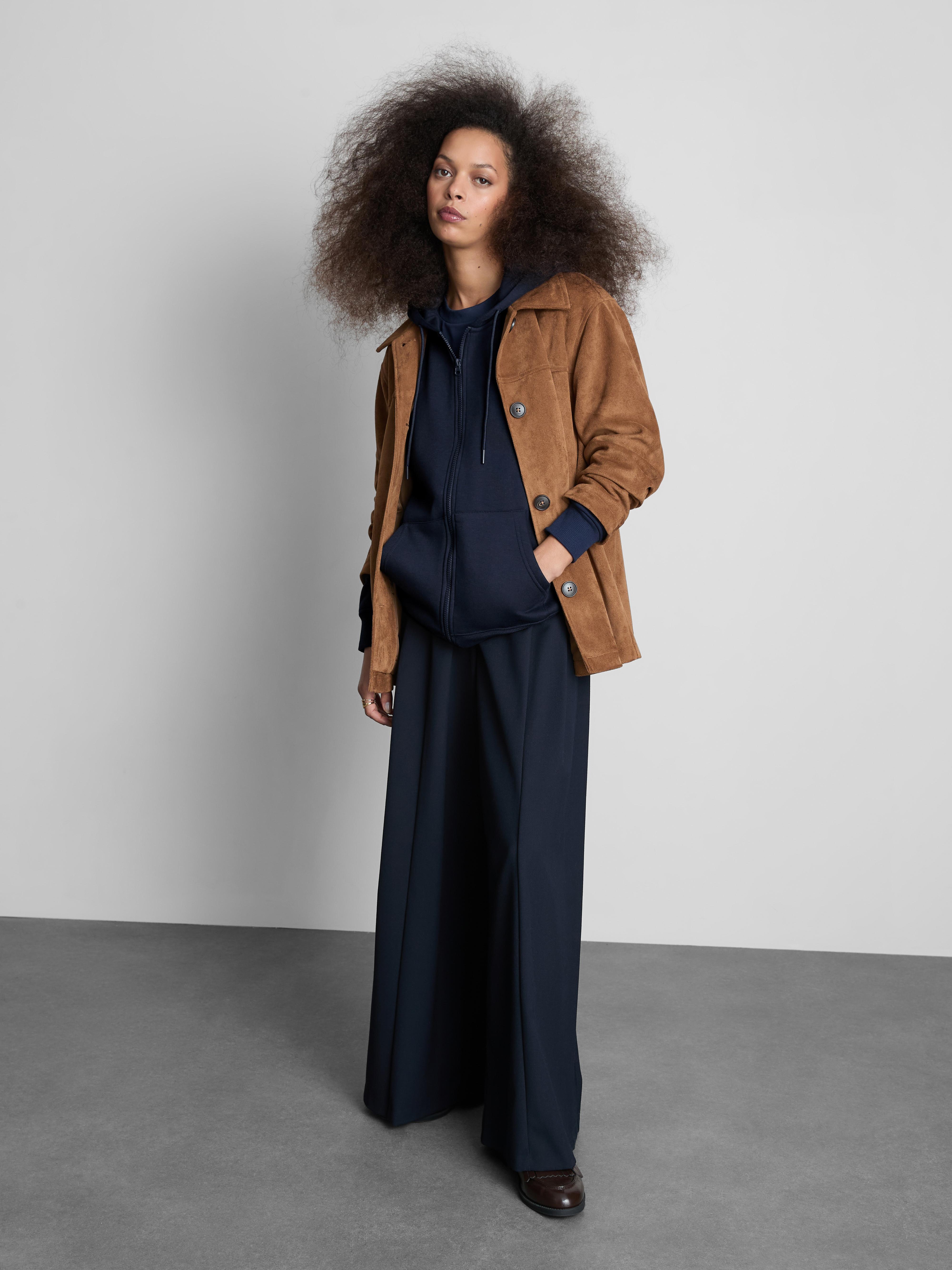 A zip-through hoodie with a split kangaroo pocket and drawstring hood