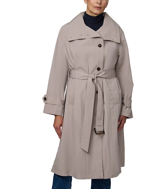 Kensie Water Resistant Hooded Point Collar Long Sleeves Side Tab Button Front Softshell Trench Coat