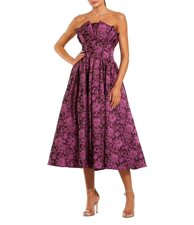 Mac Duggal 3D Flower Strapless Satin A-Line Midi Dress