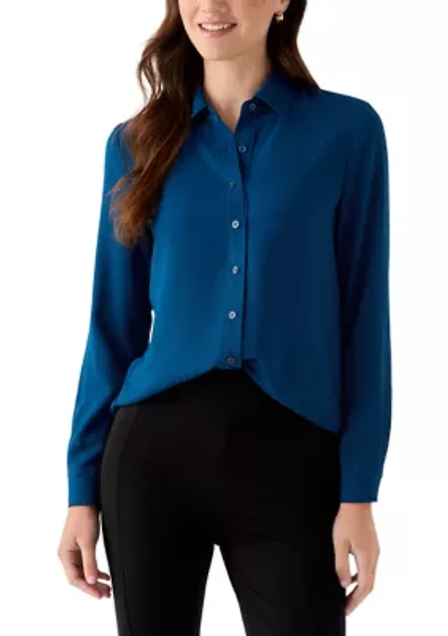 Petite Long Sleeve Popover Blouse with Covered Placket and Side Slits