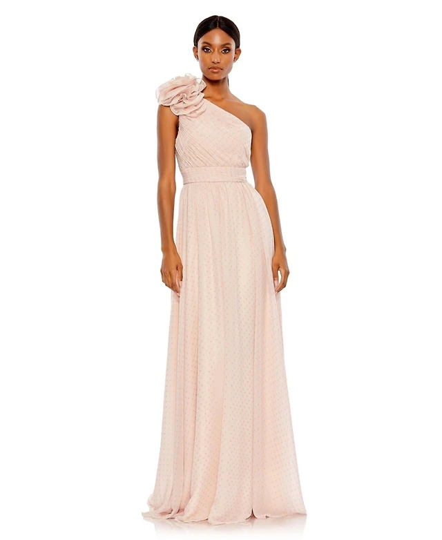 Dramatic Ruffle Edge One-Shoulder Metallic Pleated Maxi Dress