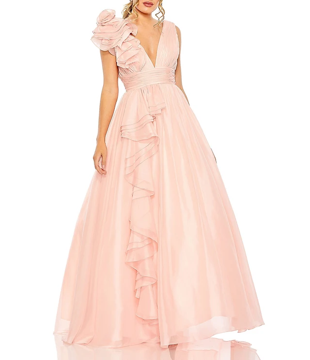 Mac Duggal Chiffon Deep V-Neck Sleeveless Ruffled Shoulder Ball Gown