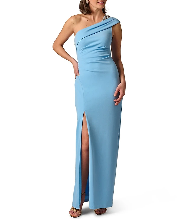 B. Darlin Off-The-Shoulder Sweetheart Neck Corseted Twist Front Side Slit Long Dress