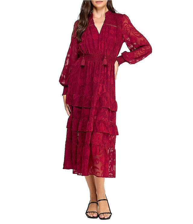 Dress the Population Savannah Jacquard Floral Print Tiered Tea Length Dress