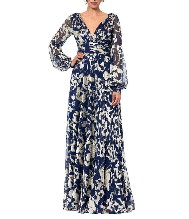 Jessica Howard Plus Size Metallic V-Neck Long Sleeve Long Gown