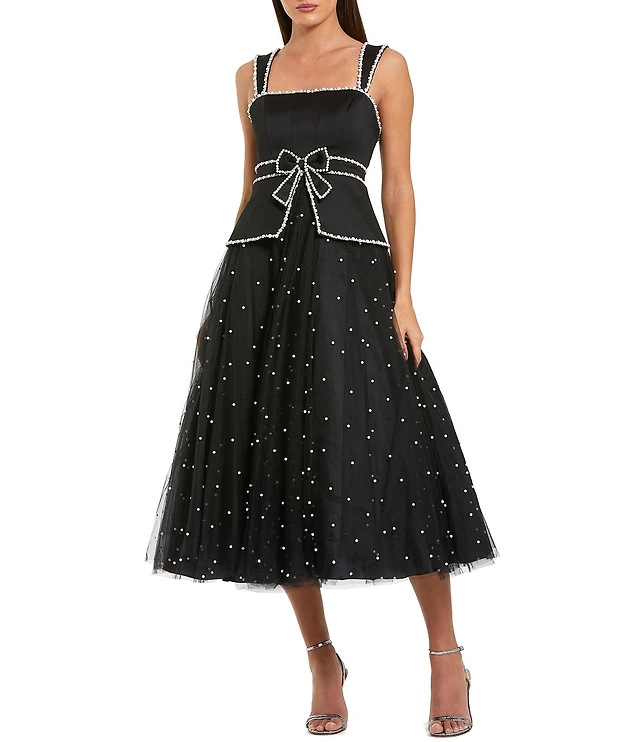 Mac Duggal Square Neck Pearl Trim Tulle Midi Dress