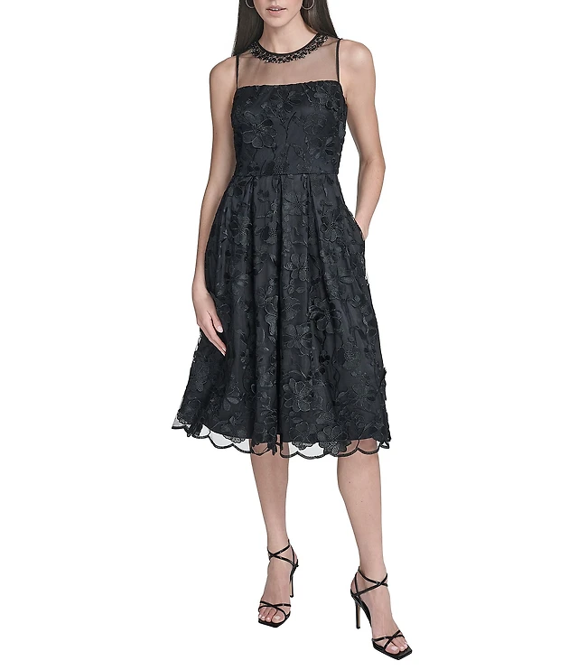 Pisarro Nights Beaded Mesh Crew Keyhole Neckline Sleeveless Sheath Midi Dress