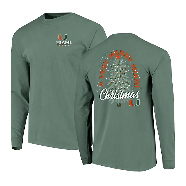 Men's Green Miami Hurricanes Comfort Colors Merry Christmas Tree Long Sleeve T-Shirt