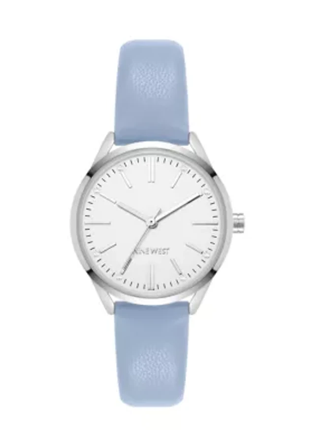 Quartz Round Silver-Tone Metal Light Blue Faux Leather Watch
