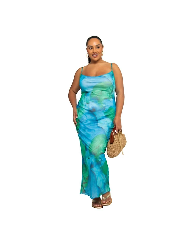 24seven Comfort Apparel Plus Green Abstract Print Batwing Sleeve Maxi Dress
