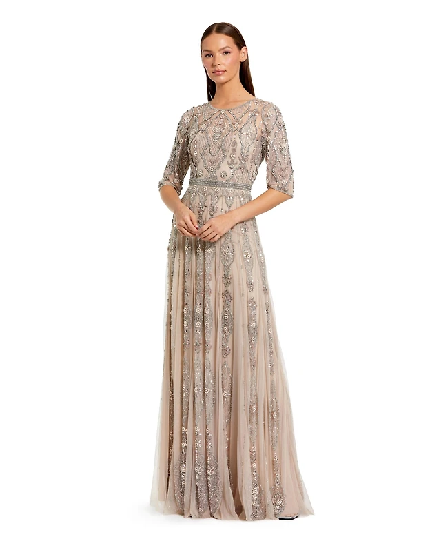 Mac Duggal Women's Embellished Mesh Long Sleeve High Neck Gown
