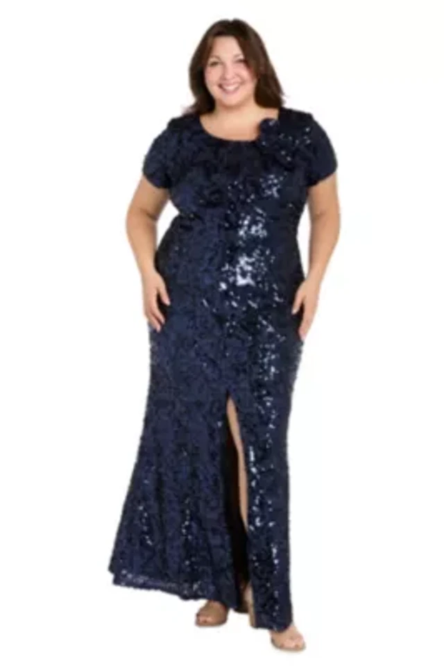 Womens Long Stretch Sequin Cap Sleeve Gown with Flower Detail