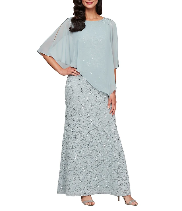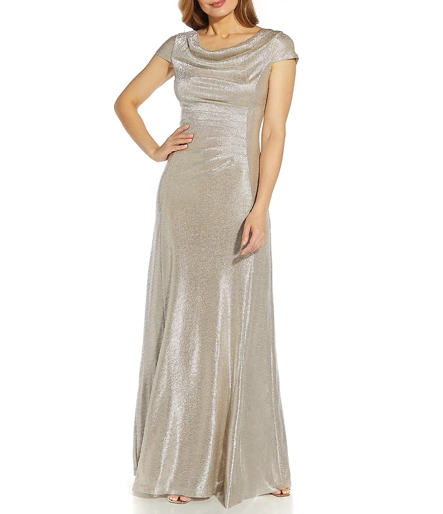 Betsy & Adam Petite Size Draped Back 3/4 Cape Sleeve Round Neck Metallic Crinkled Ruched Sheath Gown