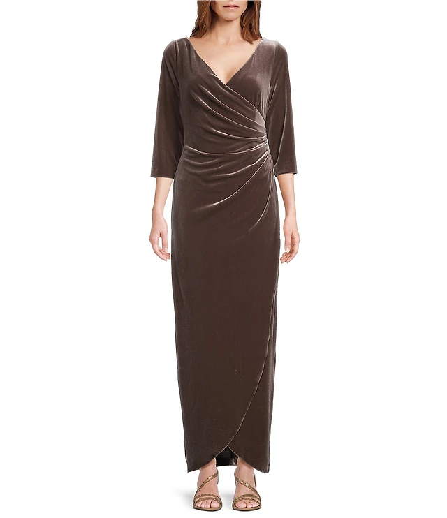 Alex Evenings Contour 3/4 Sleeve Surplice V-Neck Cascade Ruffle Skirt Gown